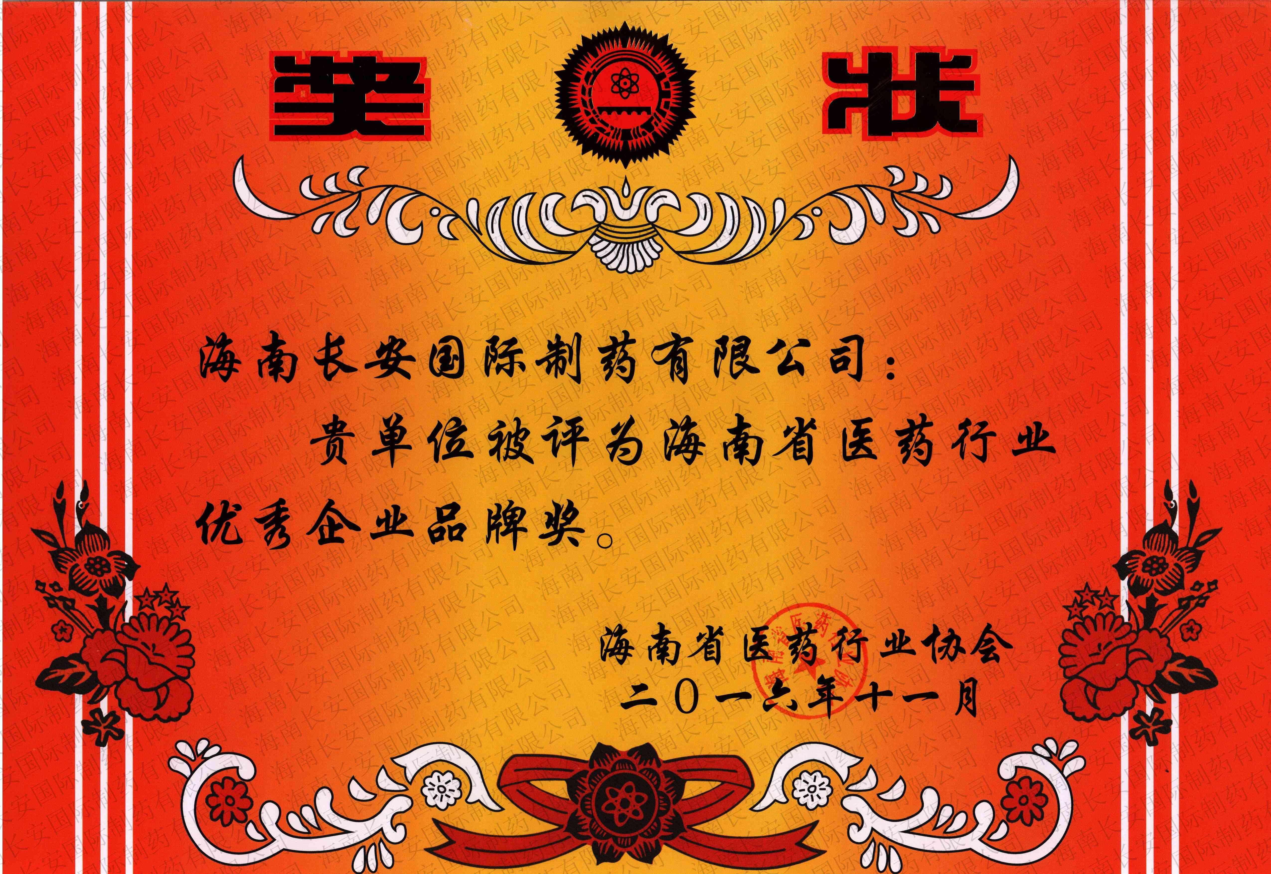 海南省醫藥行業優秀企業品牌獎