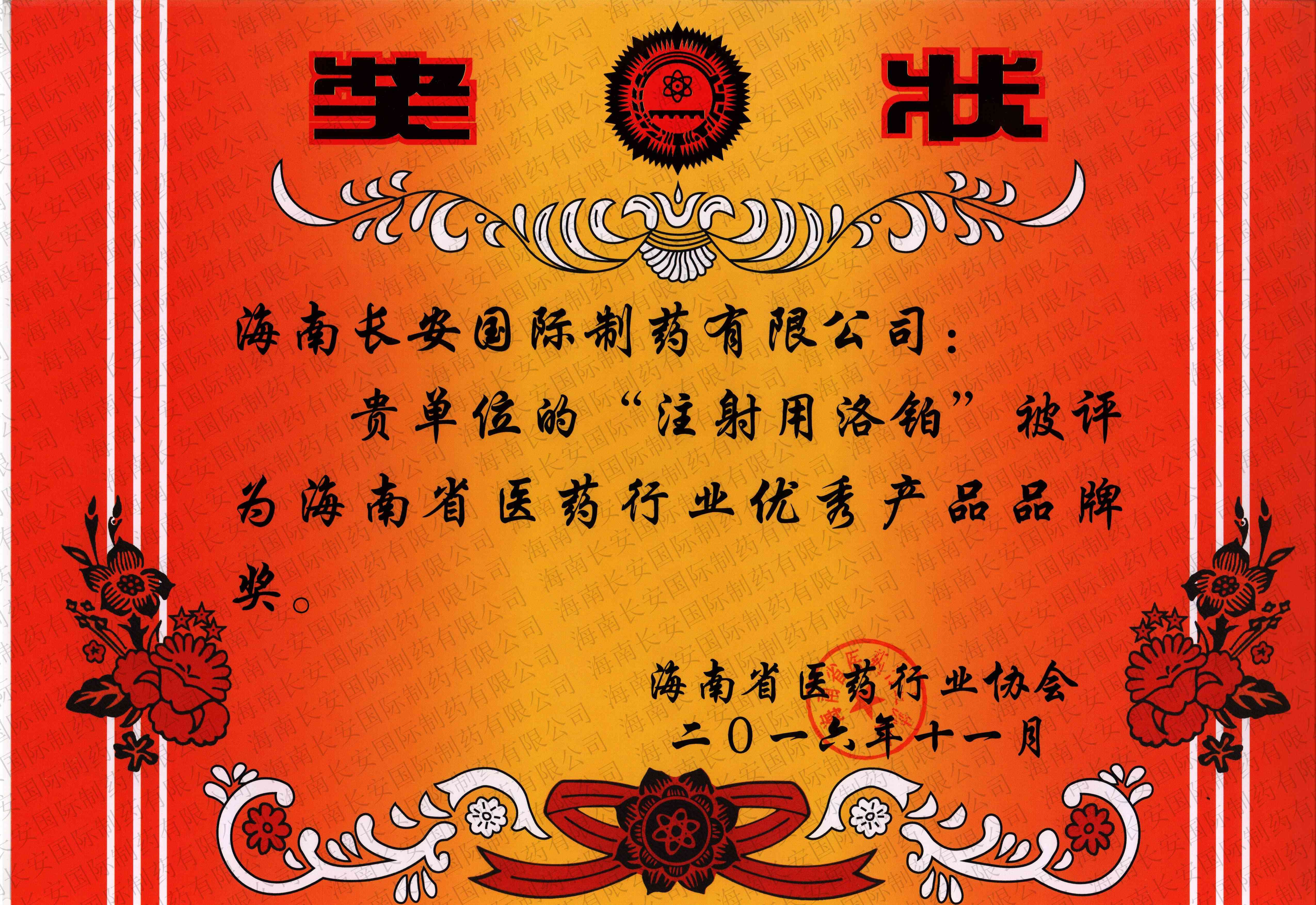 海南省醫藥行業優秀產品品牌獎