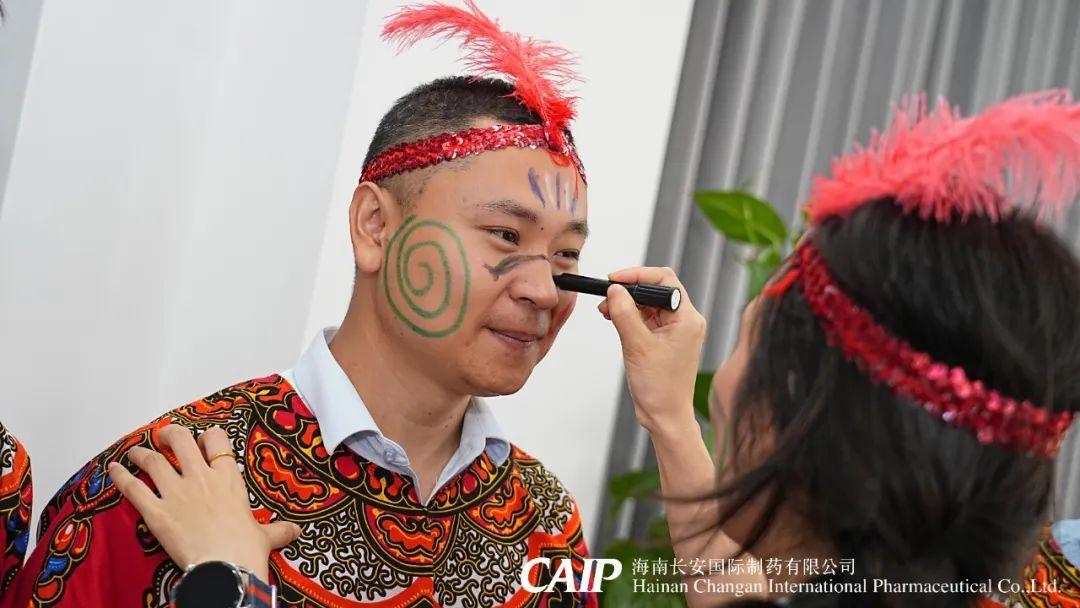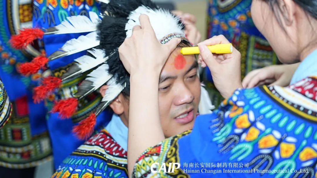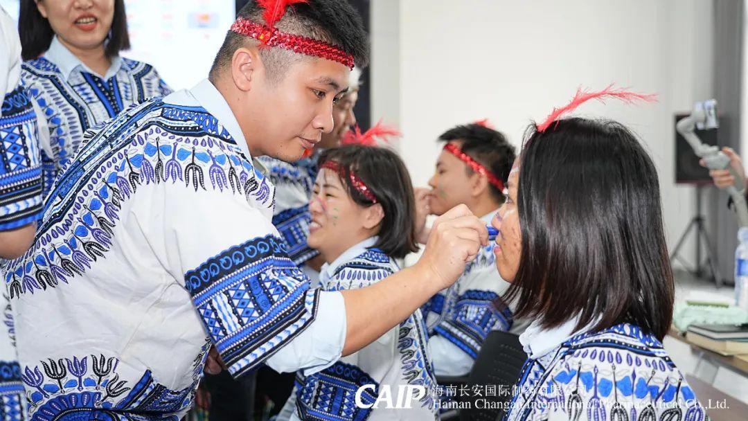 緊接著,全體骨干分為四個(gè)部落,選舉酋長、王妃和舞姬,開啟族內(nèi)建設(shè),取族名、立口號、擺隊(duì)形,并換上非洲當(dāng)?shù)氐难b扮——頭戴羽冠、特色服飾,用特殊的油彩繪制出專屬部落五彩斑斕的精致臉譜。