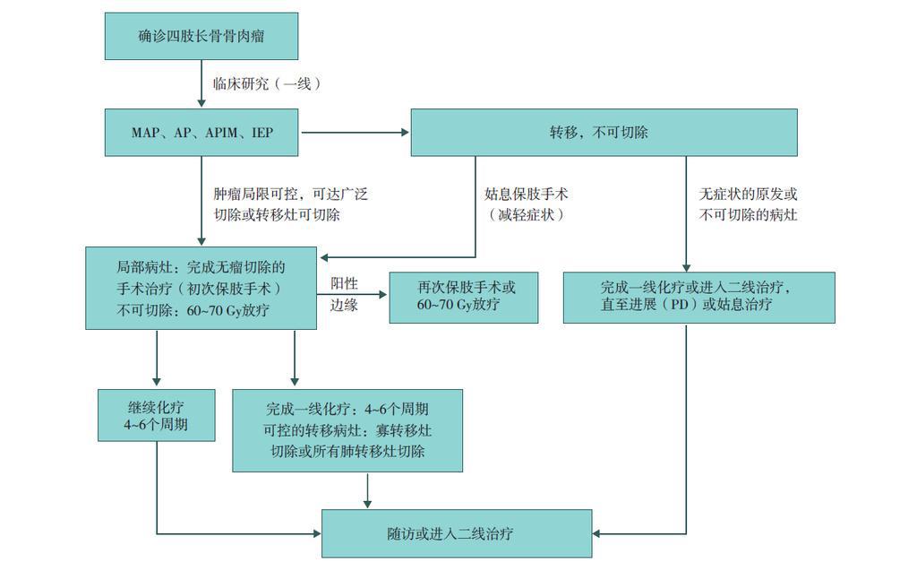 保肢治療指經(jīng)典型骨肉瘤在多學(xué)科團(tuán)隊醫(yī)生共同努力下完成的新輔助化療、保肢手術(shù)和輔助化療等一系列治療總稱,其目的是在提高患者生存率的前提下,減少局部復(fù)發(fā)、盡量保留良好的肢體功能。肢體經(jīng)典型骨肉瘤保肢治療方法如下圖所示: